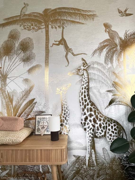 Pimpelmees introduceert het exclusieve "Giraf & Slingeraapjes" behang, een ontwerp dat de jungle tot leven brengt in de kinderkamer. Dit behang toont giraffen en slingeraapjes in een speelse setting, volledig uitgevoerd in luxe goudfolie. De glanzende afwerking voegt een vleugje elegantie toe en creëert een warme, uitnodigende sfeer. Dit kinderbehang ontwerp is ideaal voor ouders die op zoek zijn naar een unieke en stijlvolle uitstraling voor de kamer van hun kind.