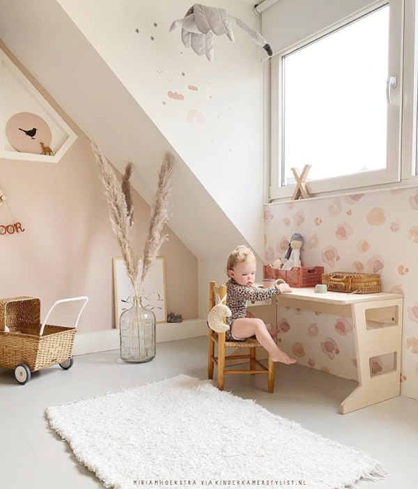 Maar wat denk je van een neutraal vloerkleed? Met een neutraal vloerkleed, bedoel ik een kleed die niet heel uitgesproken is qua kleur of patroon. Het zijn kleden die in veel soorten kamertjes gestyled kunnen worden en zich makkelijk aanpassen aan de kleuren of styling van een kamertje. Vooral in een rustig gestyled kamertje komen ze heel mooi tot hun recht. Op Instagram spotte ik een aantal prachtig rustige kamertjes met daarin een naturel of neutraal vloerkleed. Denk ook verder dan een standaard vloerkleed. Ook een neppe dierenhuid of een kleine badmat kunnen heel mooi staan in een kinderkamer. Extra leuk: een neutraal of een naturel vloerkleed kun je zowel in een jongenskamer als in een meisjeskamer stylen.